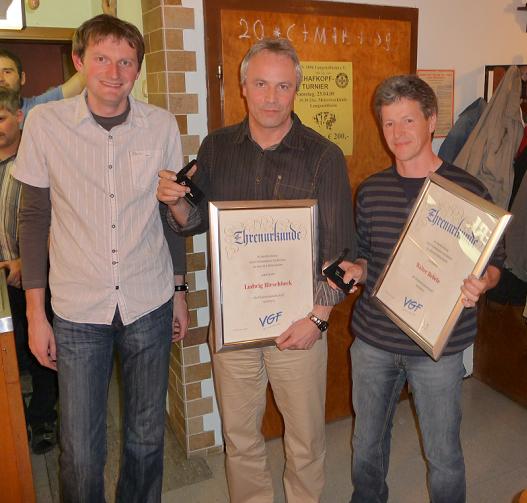 Eine ganz besondere Ehre wurde den beiden ebenfalls ausscheidenden Vorstandschaftsmitgliedern Ludwig Hirschbeck und Walter Rebele zuteil. Für ihre langjährigen Verdienste um den VGF (seit Gründung des Vereins vor 27 Jahren ununterbrochen in der Vorstandschaft tätig) wurden sie unter kräftigem Applaus der großen VGF-Familie zu Ehrenmitgliedern ernannt und mit einer Ehrennadel und Ehrenurkunde ausgezeichnet.